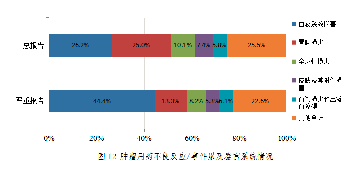 2018年腫瘤用藥不良反應/事件總體報告累及器官系統的前5位為血液系統損害、胃腸損害、全身性損害、皮膚及其附件損害、血管損害和出凝血障礙,嚴重報告累及器官系統的前5位為血液系統損害、胃腸損害、全身性損害、血管損害和出凝血障礙、皮膚及其附件損害。總體而言,骨髓抑制、白細胞減少、粒細胞減少、血小板減少等血液系統損害,惡心、嘔吐、腹瀉等胃腸損害,以及發熱、乏力等全身性損害是腫瘤用藥最常見的不良反應/事件,嚴重報告中血液系統損害所占比例尤高(圖12)。